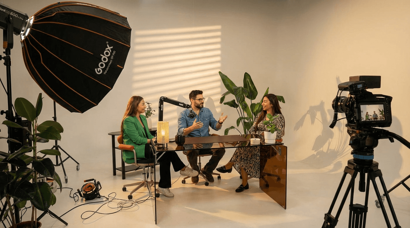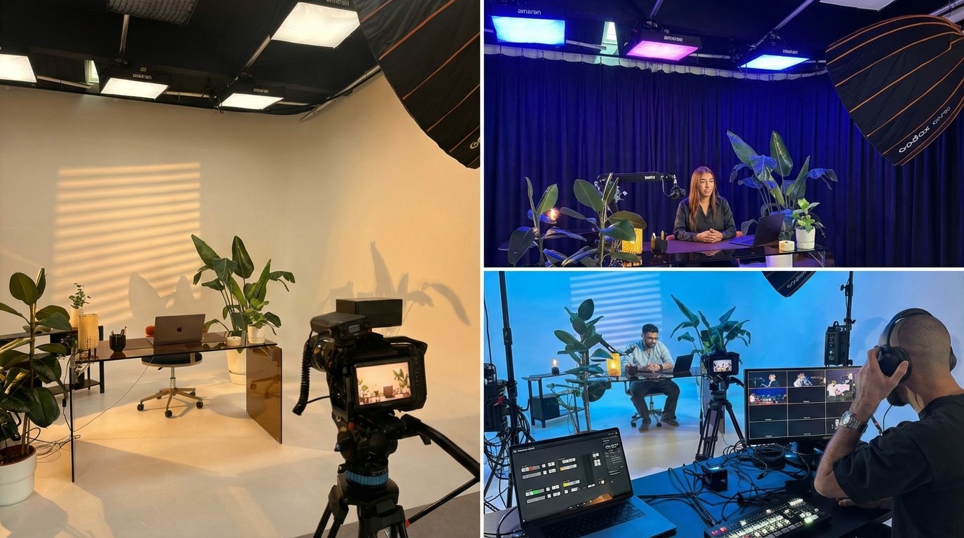 Un studio conçu pour filmer sereinement. Un cadre professionnel, une ambiance détendue, et tout le matériel déjà en place.