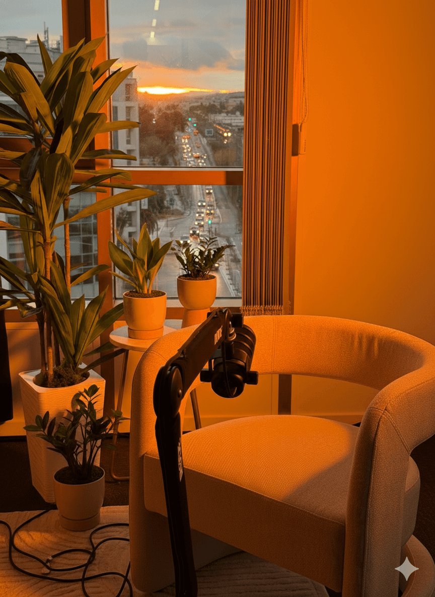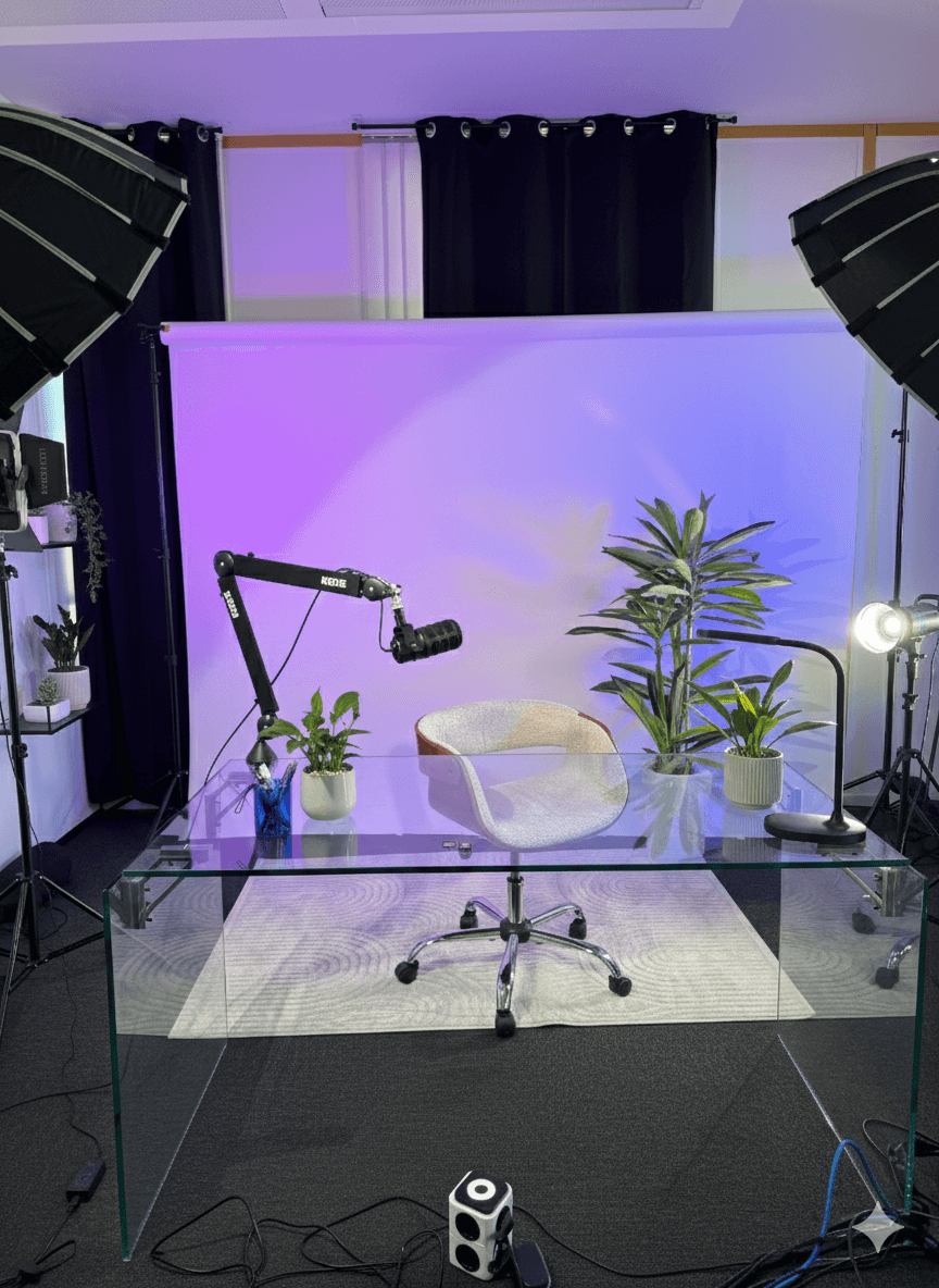 Un studio conçu pour filmer sereinement. Un cadre professionnel, une ambiance détendue, et tout le matériel déjà en place.